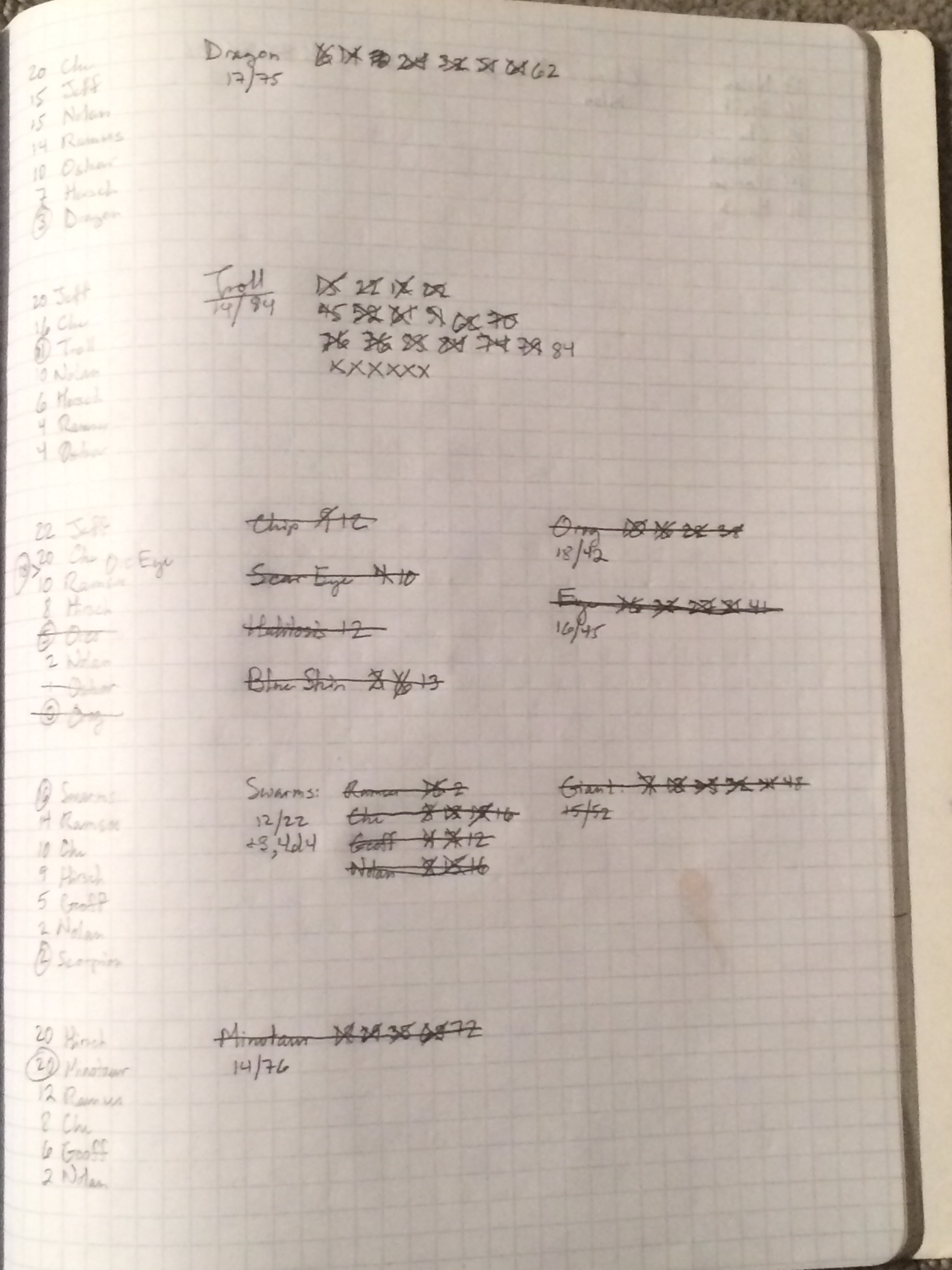 My basic template for tracking combat is first to write down everyone’s initiative in order, then to write blocks for each monster type, noting their AC and max HP. Then I give each monster a unique name, usually tied to the mini I’m using to represent them. An orc is equally likely to be represented by a gnoll or mushroom mini as by a proper orc mini.