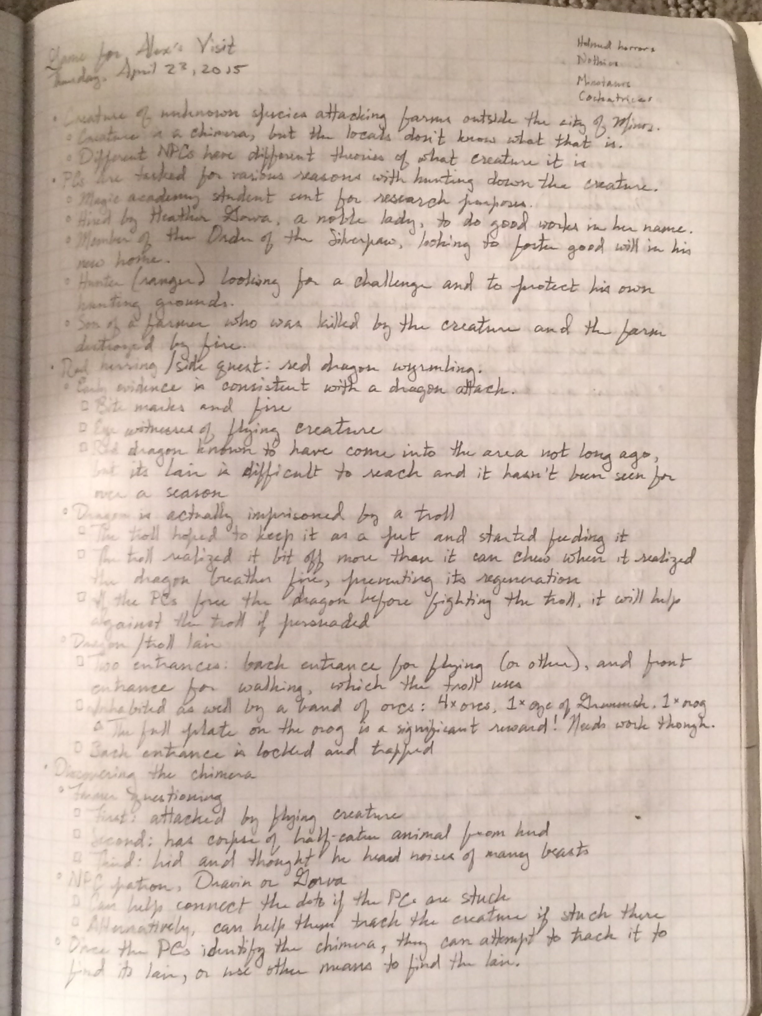As with most of my adventure building, I wrote these notes in bullets and sub-bullets. My friend Alex was visiting for a weekend, and this was designed to be a one-session adventure.